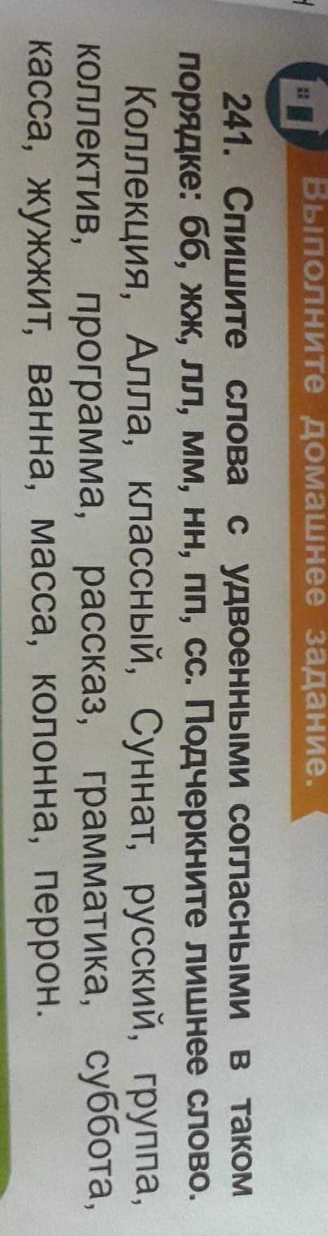Спишите слова с удвоенными согласными в таком порядке подчеркните лишнее слово коллекция Алла классный Суннат русский группа коллектив программа рассказ грамматика суббота класса жужжит ванна масса колонна перрона