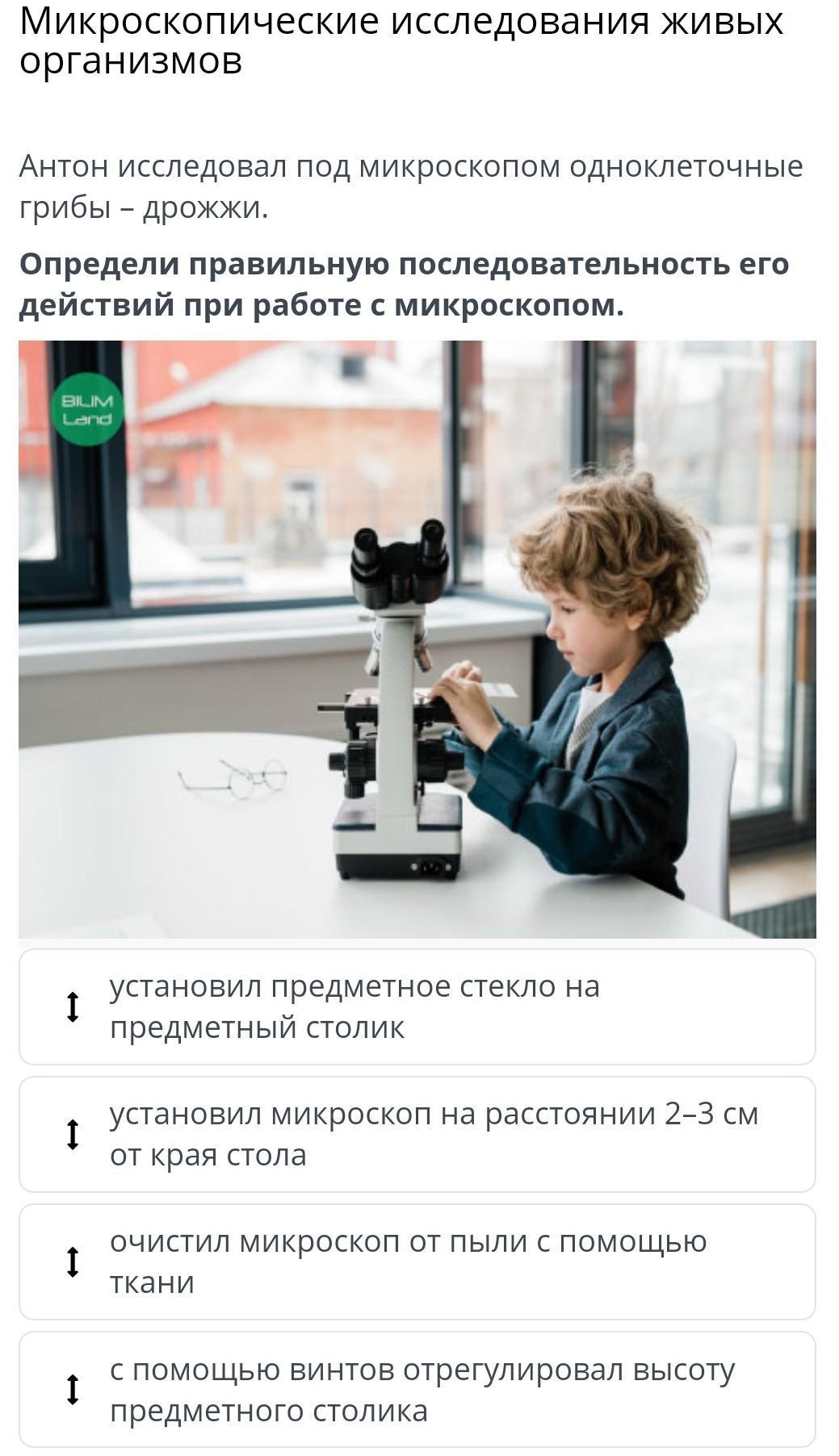 установил предметное стекло на предметный столик