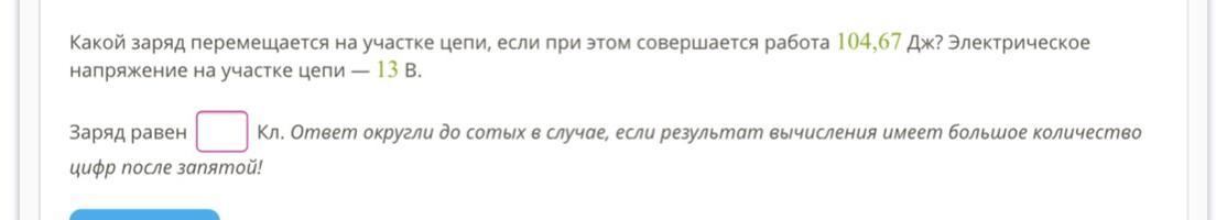 Какой заряд перемещается на участке цепи, если при этом совершается работа 104,67 Дж? Электрическое напряжение на участке цепи - 13 В.
