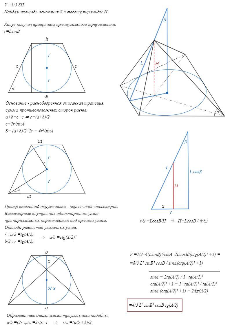 Эта трапеция описана около окружности основания конуса. Вершина пирамиды лежит на одной из образующих конуса, а ее проекция на плоскость основания совпадает с точкой пересечения диагоналей трапеции. Найдите объем пирамиды, если образующая конуса равна