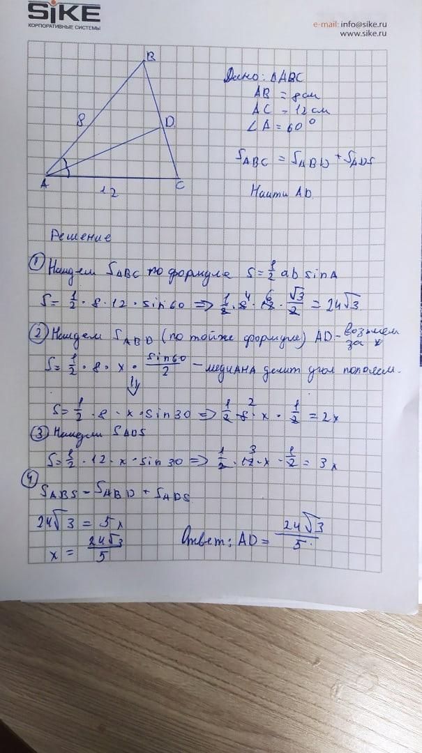 Найдите биссектрису AD треугольника ABC, если AB = 8 см, AC = 12 см и угол A=60° (указание: SABС=SABD+SADC).