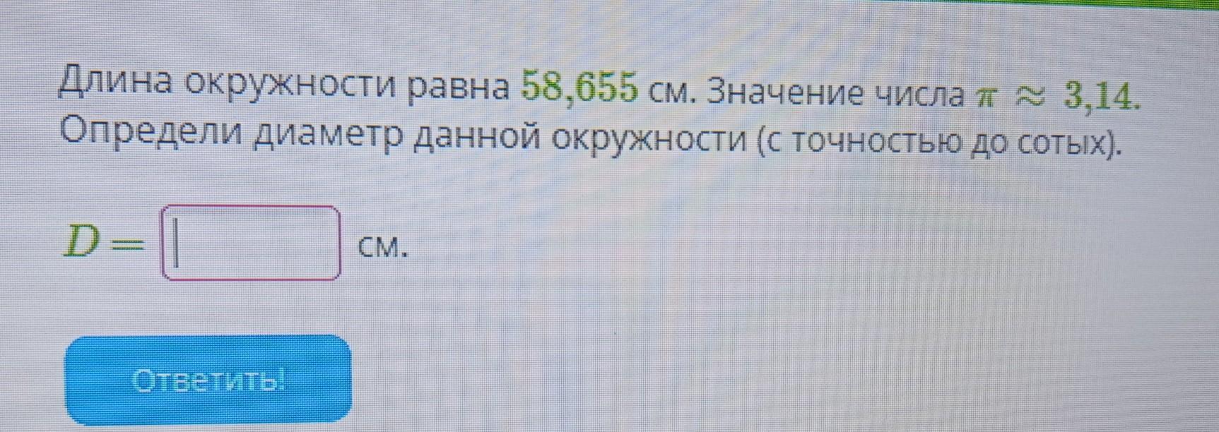 , откуда D = 58,655 : 3,14 ≈ 18,68 (см)