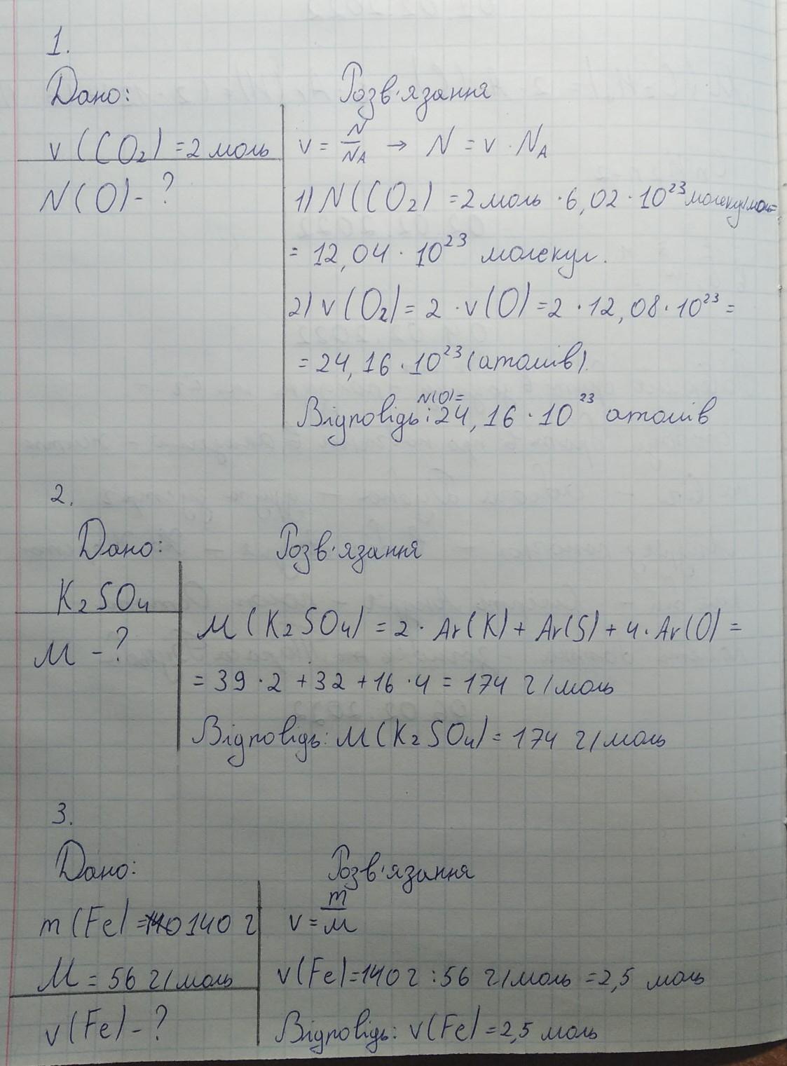 Задачі з теми “Кількість речовини” Задача 1. Обчисліть кількість атомів Оксигену у 2 моль вуглекислого газу С02. Задача 2. Обчисліть молярну масу речовини за її формулою K2S04 Задача 3. Яка кількість речовини заліза міститься у зразку заліза масою 140г? Задача 4. Визначте, який об'єм за нормальних умов займають 5 моль метану СН4.ЕТО ОЧЕНЬ СРОЧНО!!!!!!!!!!!!!!!!!!