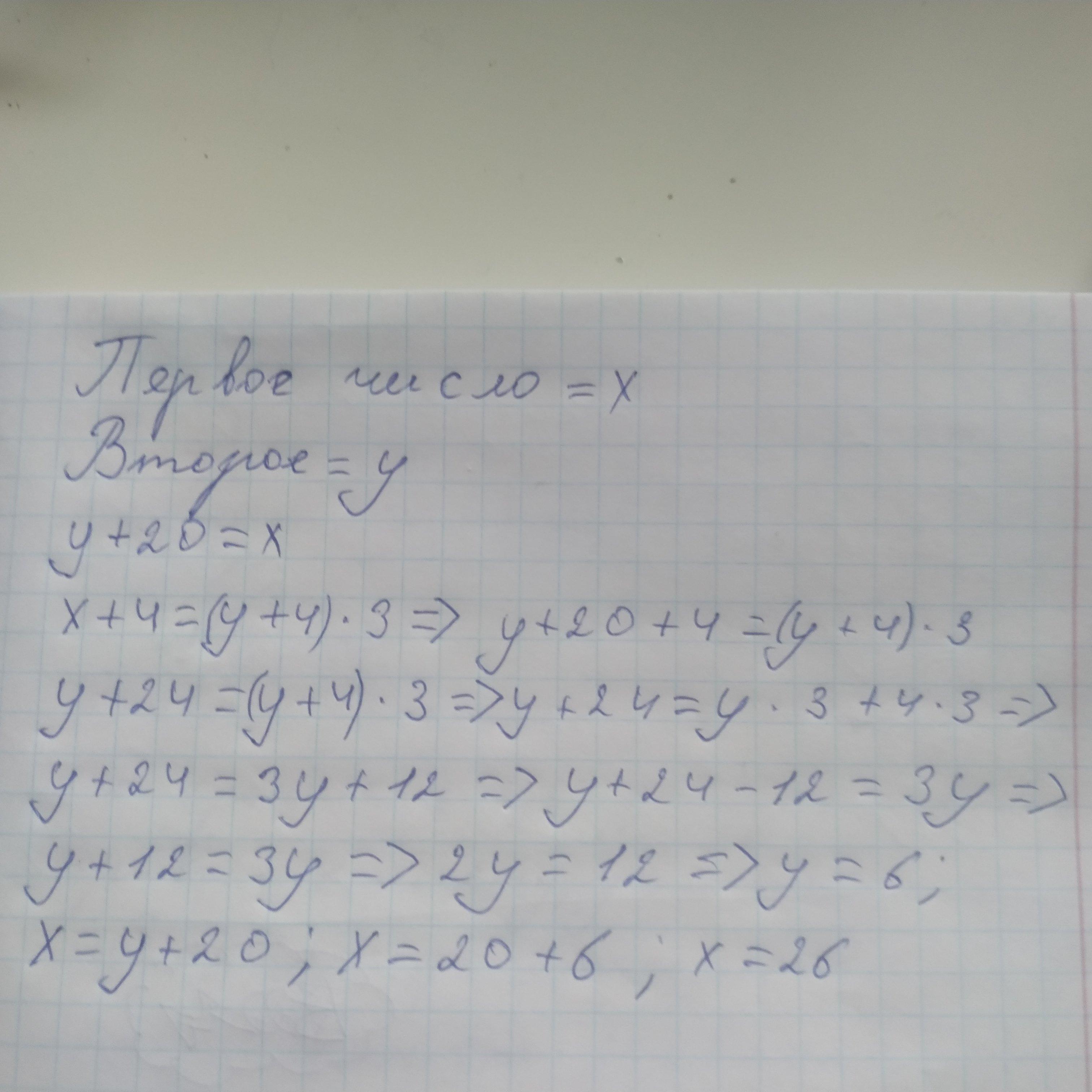 Первое число больше второго на 20. Если прибавить обеим числам по 4, то первое число будет больше второго в 3 раза. Чему была равна первоначально большее из этих чисел?