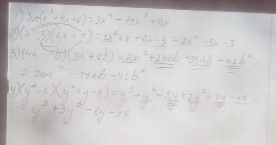 1) 3х*(х(в кубе)-4х+6) 2) (х-3)*(2х+1) 3) (4а-7b)*(5a+6b)