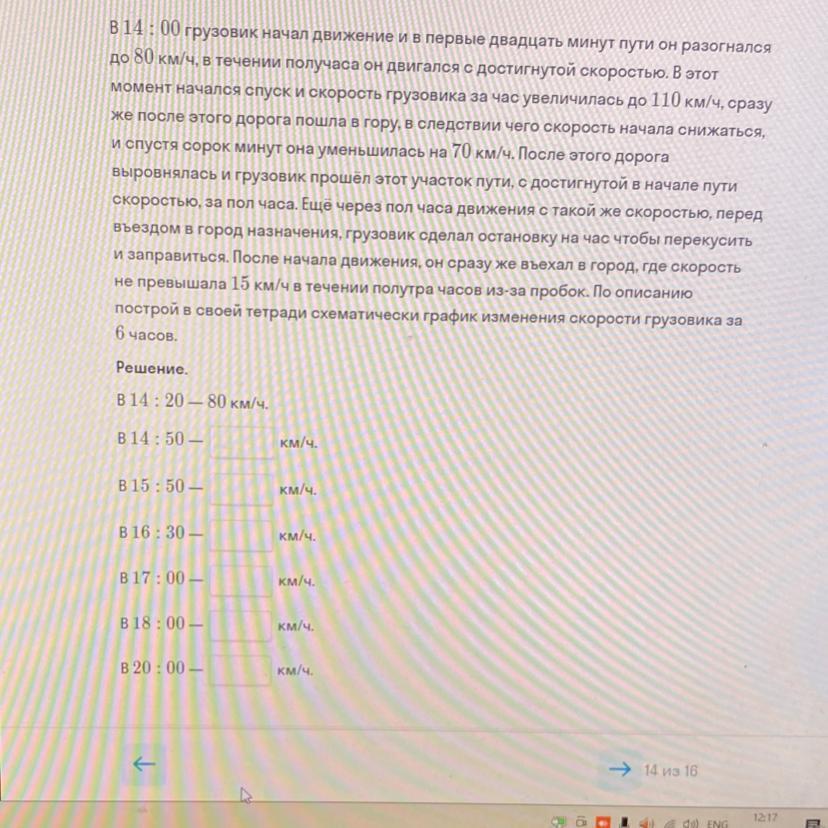 В 14:00 грузовик начал движение и в первые двадцать минут пути он разогнался