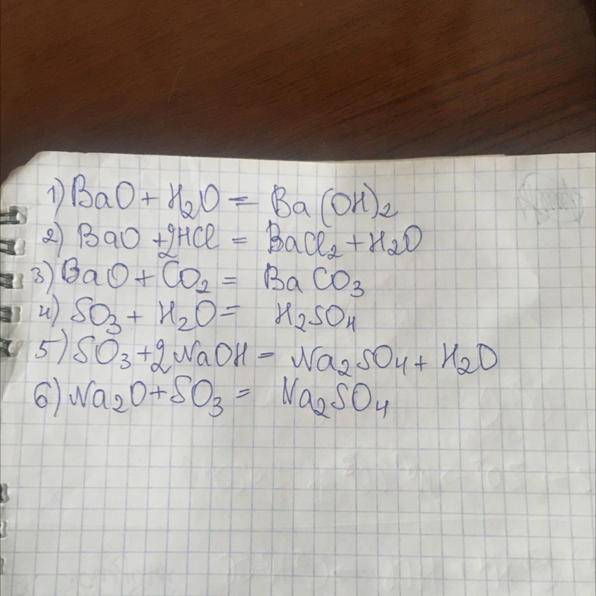 Составьте уравнения: ВаО +H2O = 2 / 2 ВаО +HCl = ВаО +CO2 = SO3 +H2O = SO3 + NaOН= Na2O + SO3=