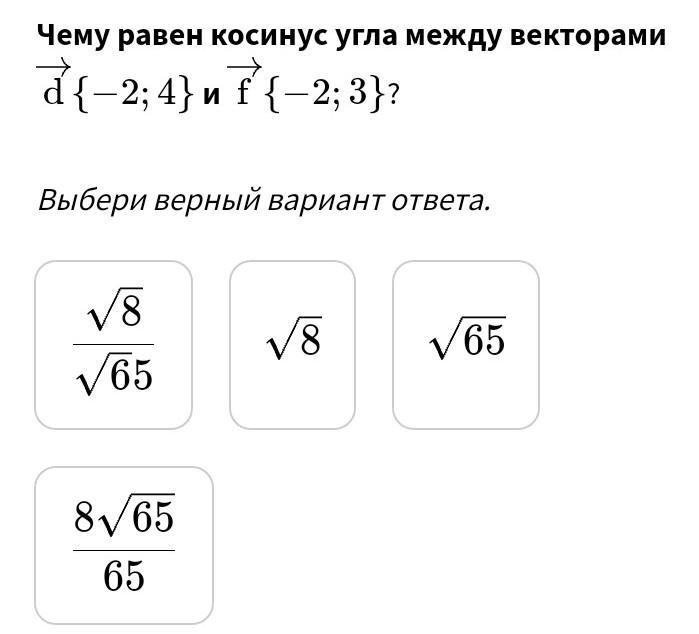 если нам известно координаты вектора,и нужно найти косинус угла между векторами будем использовать формулу: