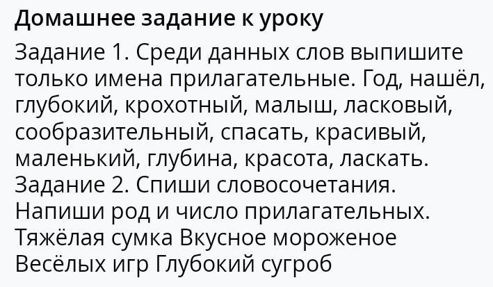 Домашнее задание к уроку Напиши род и число прилагательных. Задание 1. Среди данных слов выпишите только имена прилагательные. lceil oA, нашёл, глубокий, крохотный, малыш, bI tilde V сообразительный 1bI tilde V , спасать, красивый, маленький, глубина, красота, ласкать. Задание 2. Спиши словосочетания. Тяжёлая сумка Вкусное мороженое Весёлых игр Глубокий сугроб