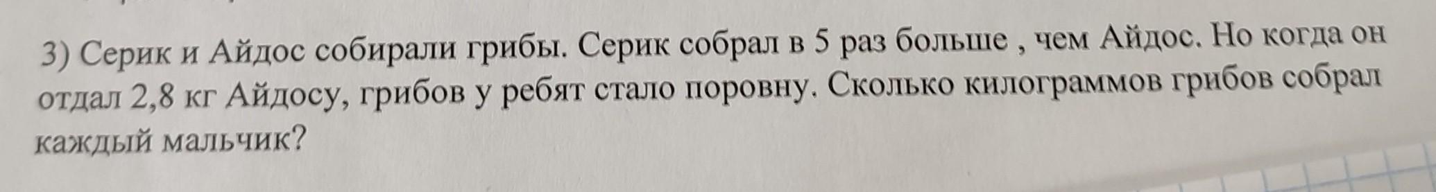 Серик и Айдос собирали грибы. Серик собрал в 5 раз больше, чем Айдос. Но когда он отдал 2,8 кг Айдосу, грибов у ребят стало поровну. Сколько килограммов грибов собрал каждый мальчик?