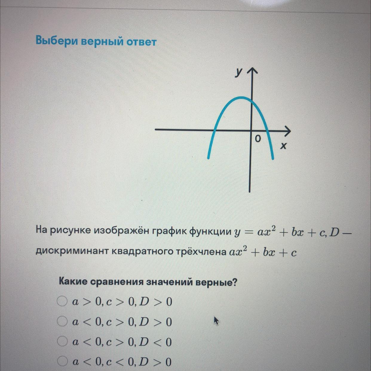 На рисунке изображён график функции y = ax2 + bx + c, D —