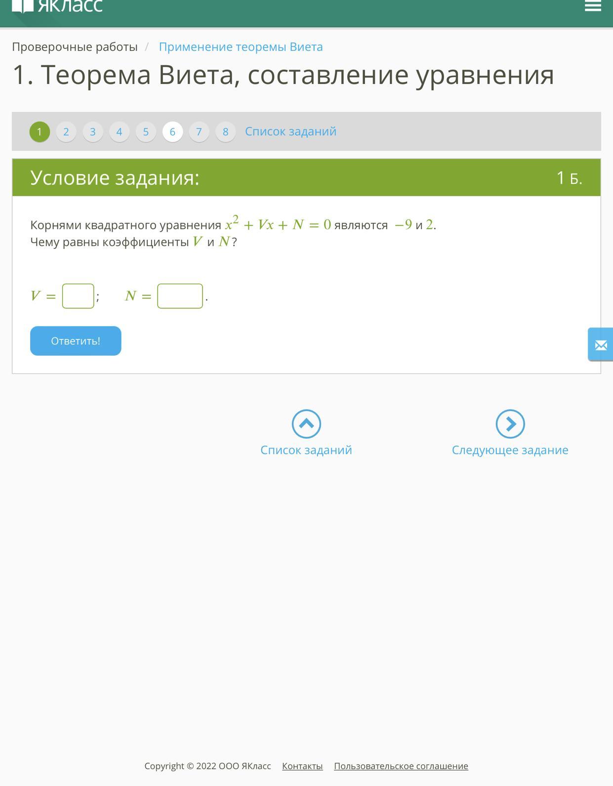 Корнями квадратного уравнения x2+Vx+N=0 являются -9 и 2.