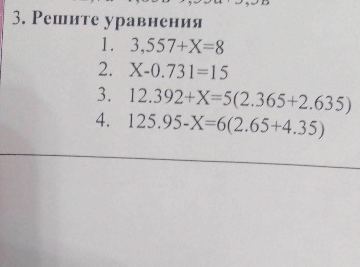 Решите уравнения 1.) 3,557+X=8. 2) . X-0.731=15 3) . 12.392+X=5(2.365+2.635)4.)125.95-X=6(2.65+4.35)