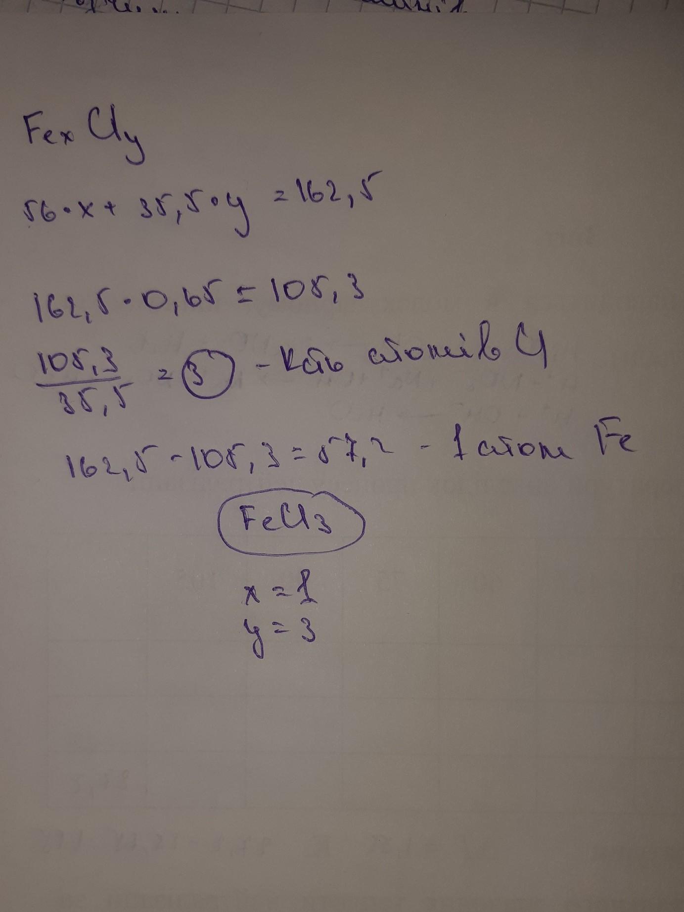 Масова частка Хлору в сполуці дорівнює 65%, визначте формулу речовини FeXCLY, якщо відносна молекулярна маса дорівнює 162,5