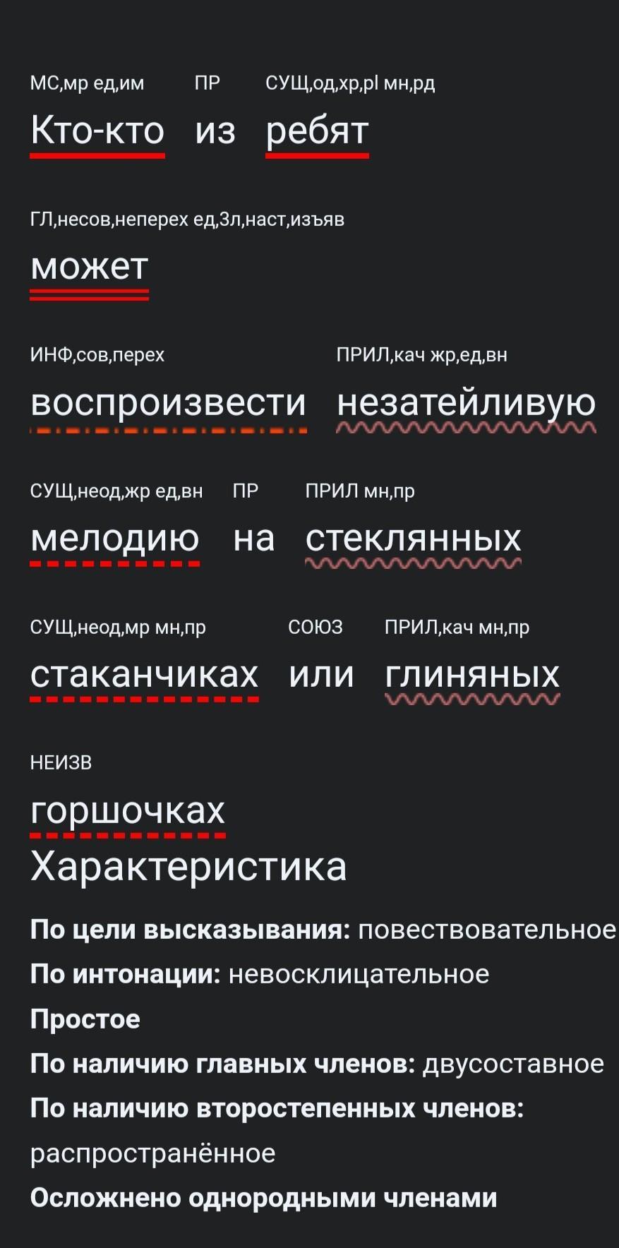 синтаксический разбор предложения Кто-кто из ребят может воспроизвести незатейливую мелодию на стеклянных стаканчиках или глиняных горшочках