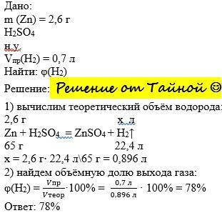 ДАЮ 50 БАЛОВ!!!!!!! В результате действия сульфатной кислоты на 2,6 г цинка добыли 0,7 л водорода (н.у.). Определите объемную часть выхода продукта от теоретически возможного.