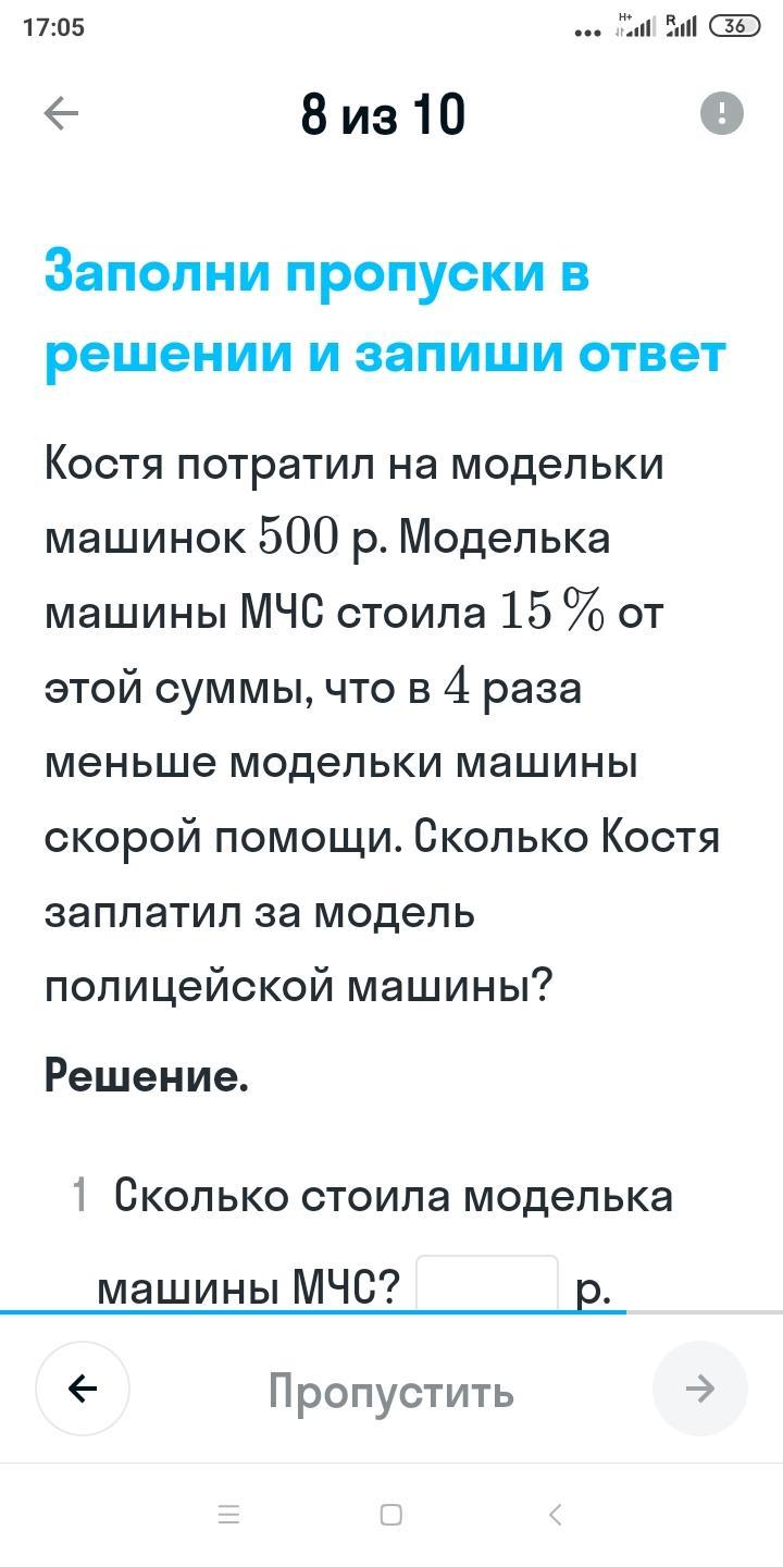 1) 500 * 0,15 = 75 (руб) - стоила модель МЧС