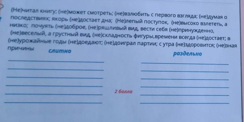 не читал книгу ; не может смотреть ; невзлюбить с первого взгляда ; не думая о последствиях ; якорь недостаёт дна ; нелепый поступок ; невысоко взлететь , а низко ; почуять недоброе , неряшливый вид , вести себя непринуждённо , не весёлый , а грустный вид , нескладность фигуры , времени всегда недостаёт ; в неурожайные годы недоедают ; недоиграл партии ; с утра нездоровится ; незная причины