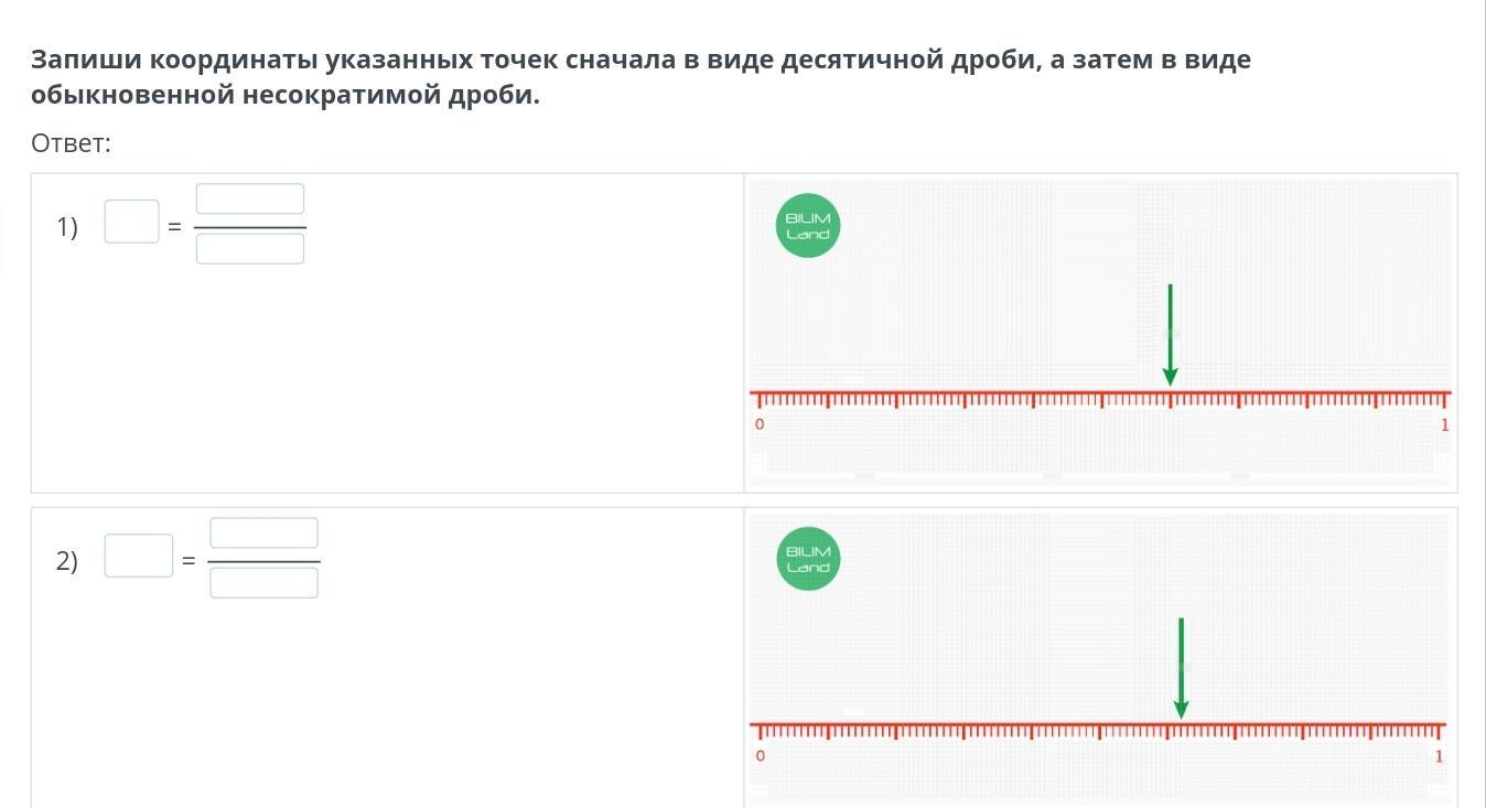 Запиши координаты указанных точек сначала в виде десятичной дроби, а затем в виде обыкновенной несократимой дроби.