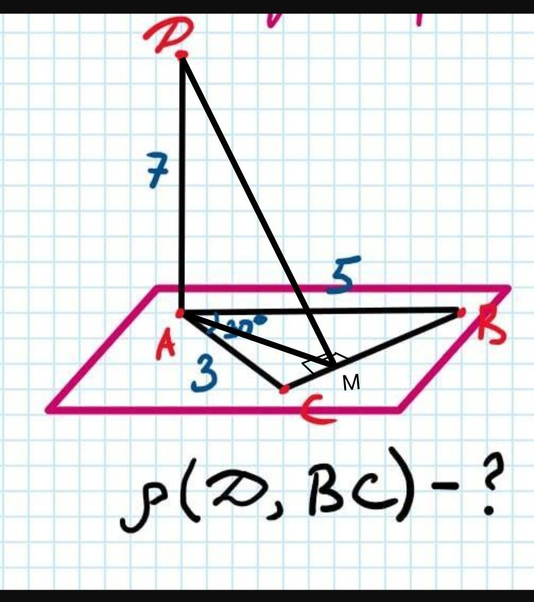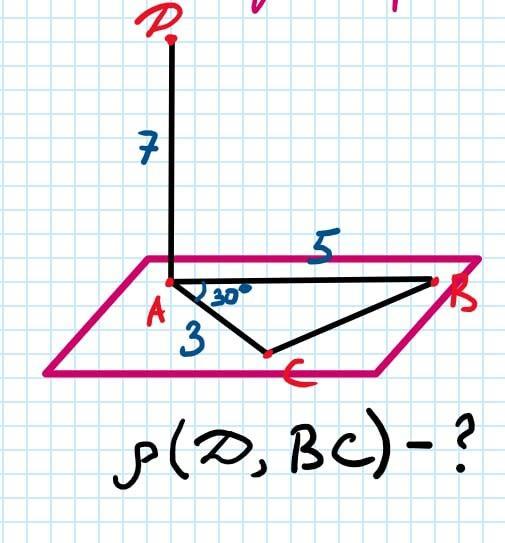 Пожалуйста помогите по теореме трёх перпендикуляров. Прямая DA перпендикулярная плоскости альфа (в плоскости лежит треугольник ABC) и касается точки А. AC = 3 см. AB = 5 см. Угол BAC = 30 градусов. DA = 7 см. Найти расстояние от точки D до BC в см.