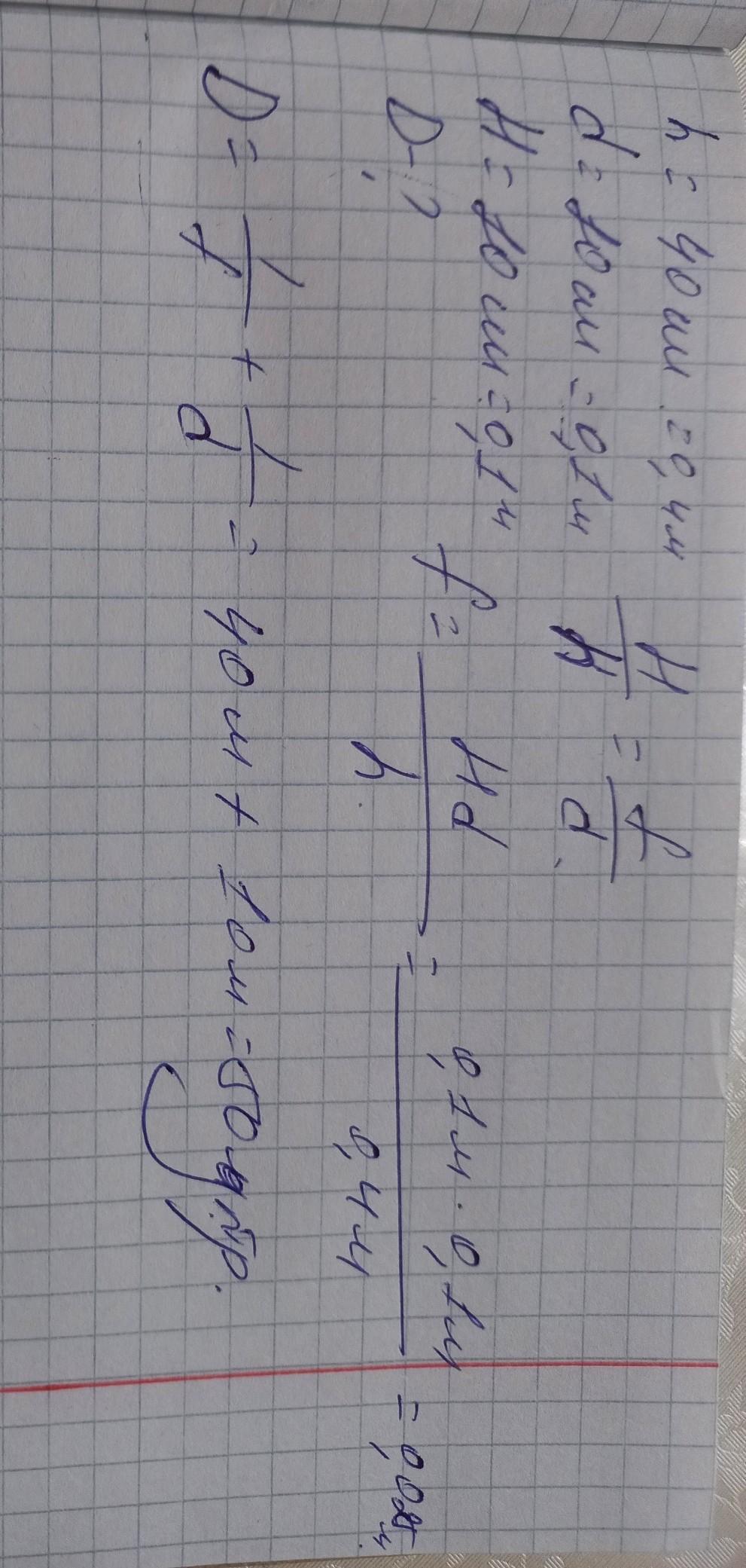 Предмет заввишки 40 см знаходиться на відстані 10 см від лінзи. Визначте оптичну силу лінзи, якщо розмір зображення 10 см. Охарактеризуйте зображення.