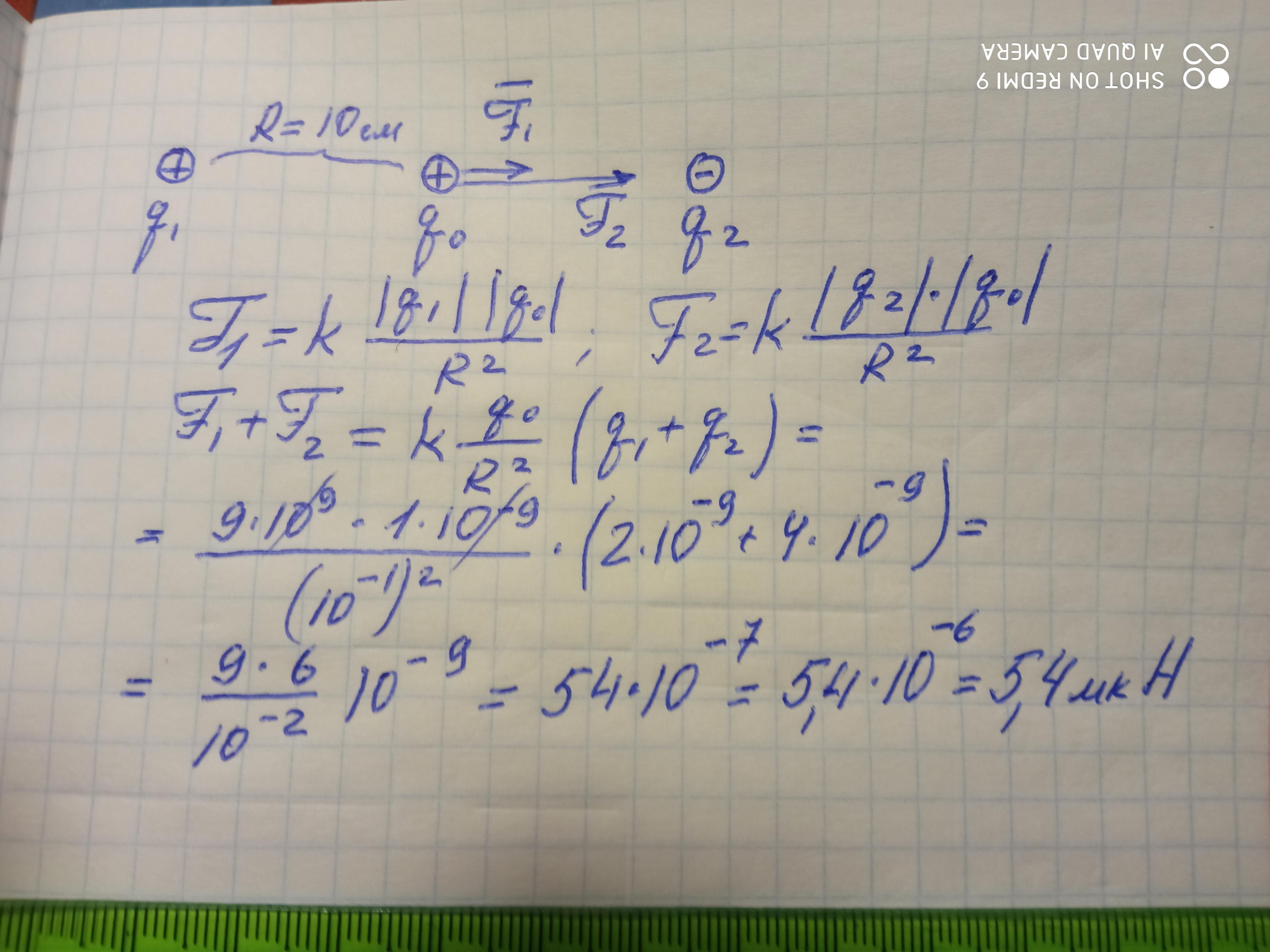 Два точкові заряди що Дорівнюють +2 нКл та -4нКл містяться на відстані 20см один від одного. Яка сила діє на точковий заряд +1нКл розміщений посередині між цими зарядами?
