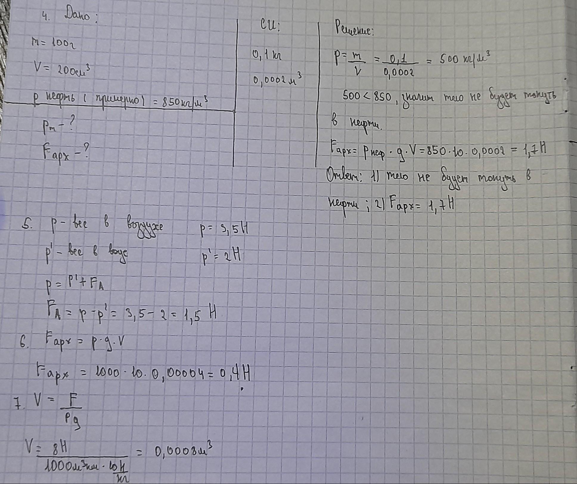 7.Определить объем тела, если на тело в воде действует выталкивающая сила 8Н.