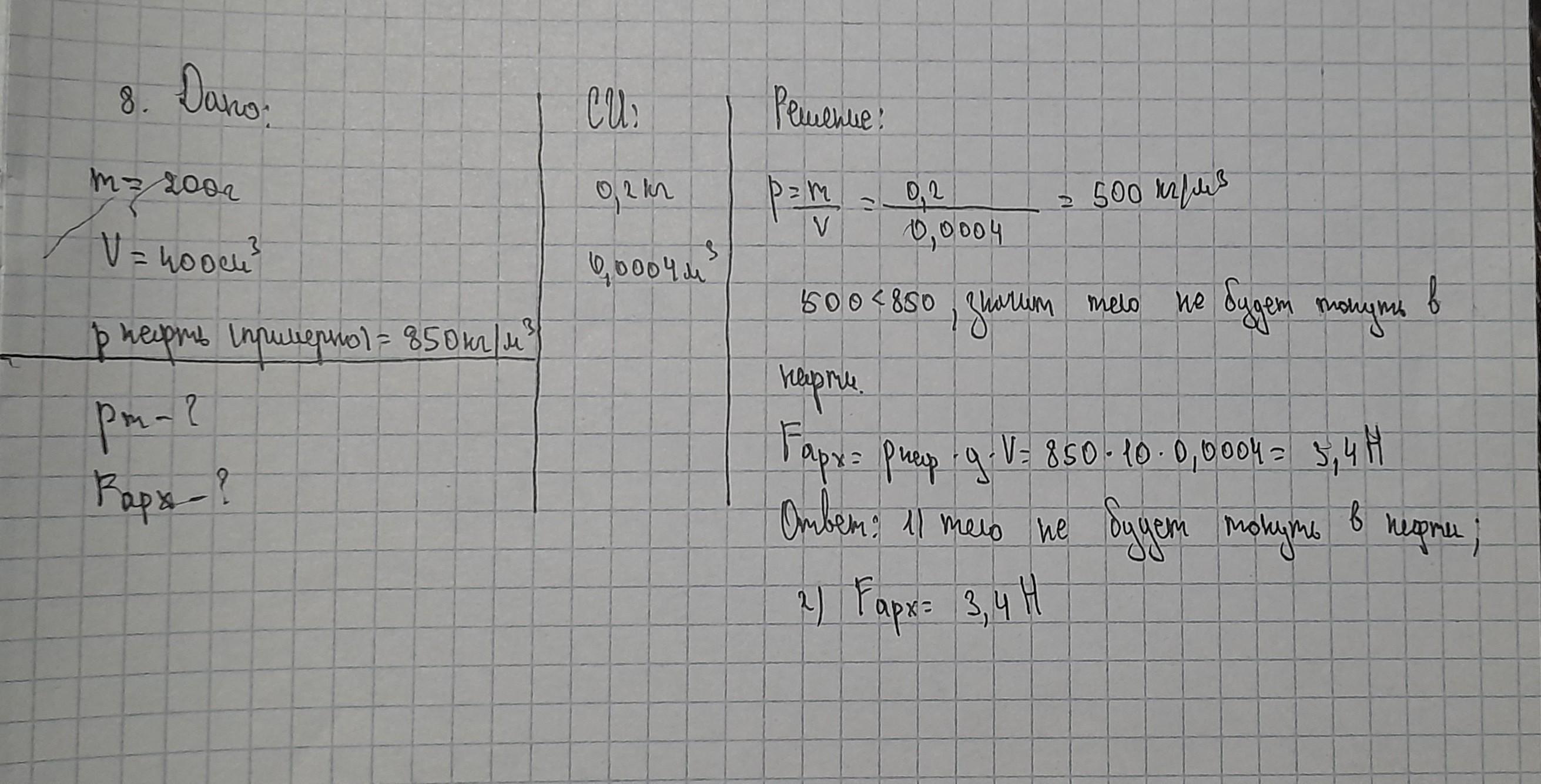 8.Тело массой 200г имеет объем 400см3. Какова архимедова сила, действующая на него? Утонет ли это тело в нефти?
