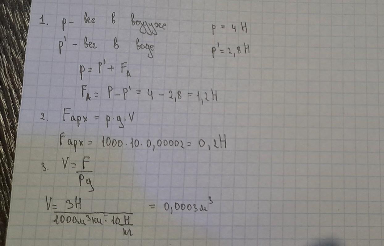 3.Определить объем тела, если на тело в воде действует выталкивающая сила 3Н.