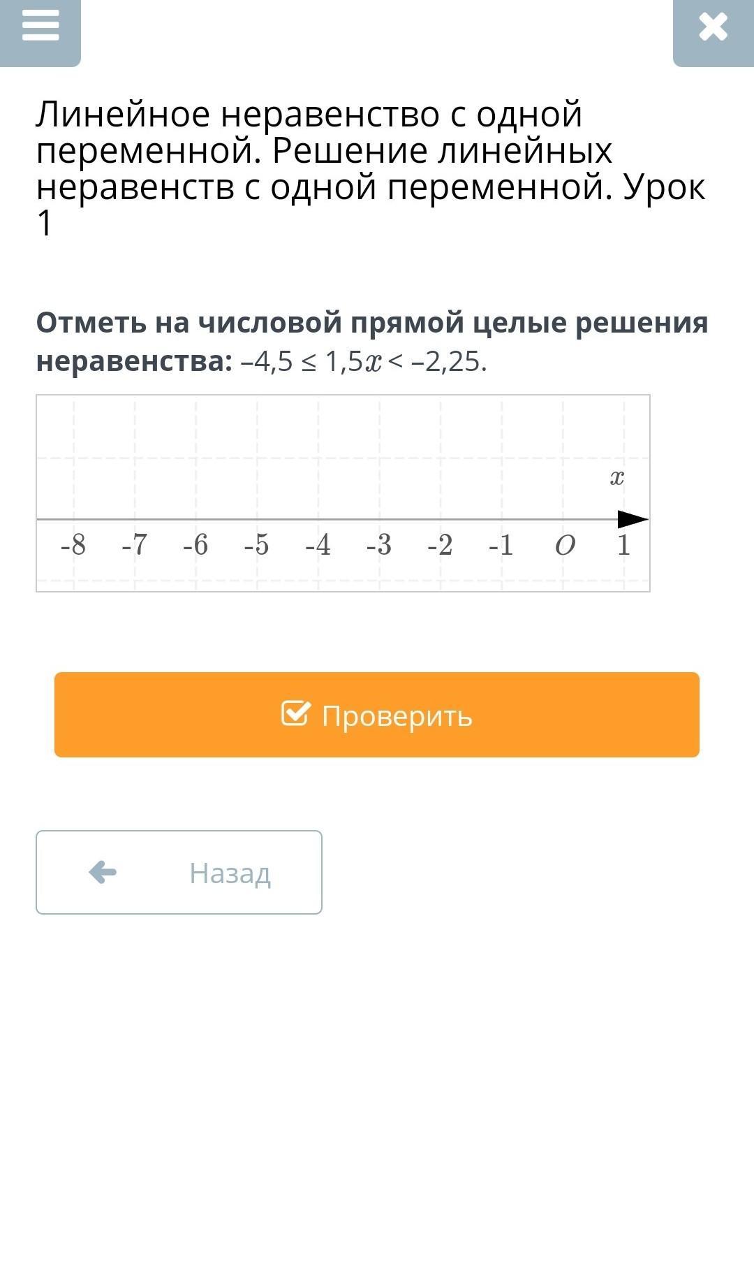 Линейное неравенство с одной переменной. Решение линейных неравенств с одной переменной. Урок 1 Отметь на числовой прямой целые решения неравенства: –4,5 ≤ 1,5x < –2,25.
