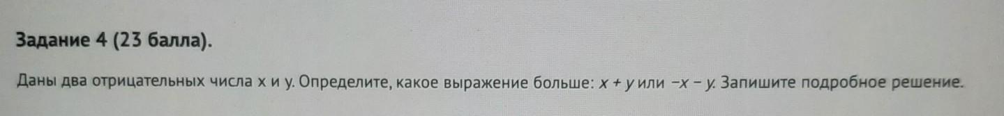 Задание 4 (23 балла). Даны два отрицательных числа хиу. Определите, какое выражение больше: x+y или -х-у. Запишите подробное решение,