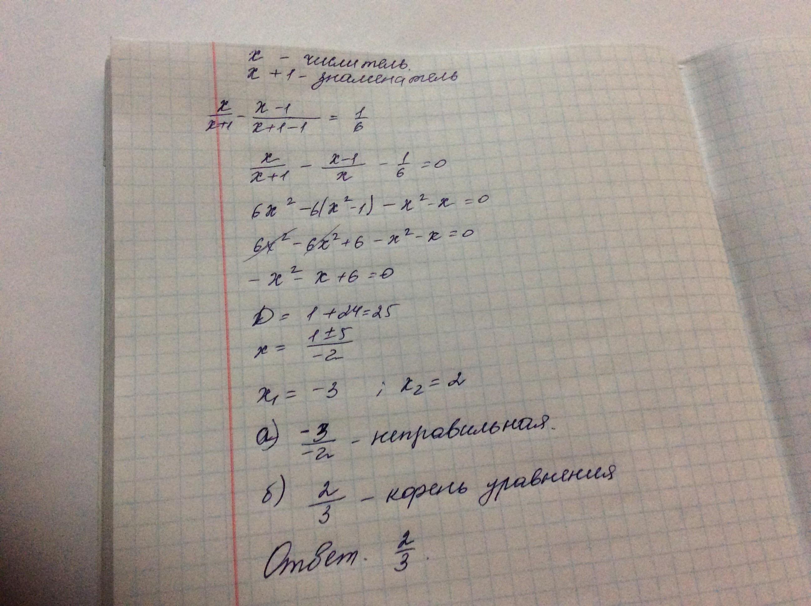 3)Так как новая дробь на 1/16 меньше, получим уравнение: x/x+1-x-1/x = 1/6
