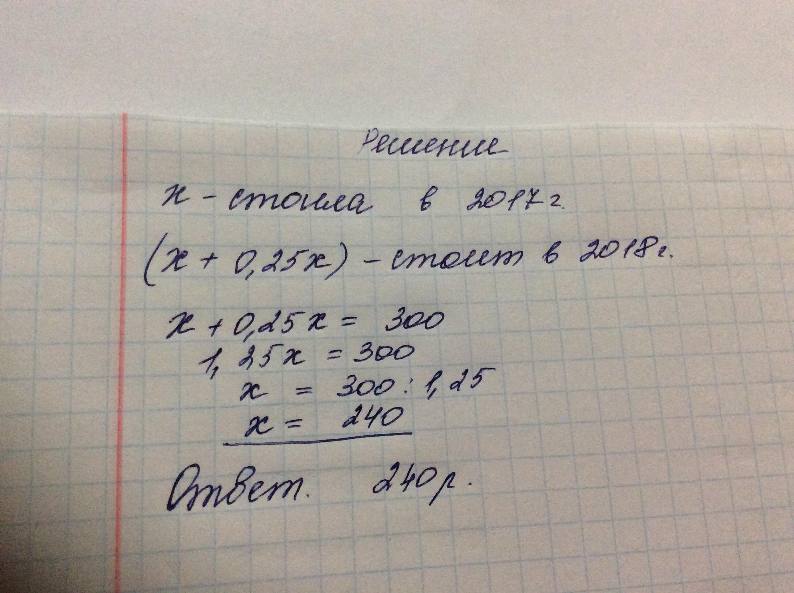 известно что в 2018 году абонентская плата по тарифу стандартный выросла на 25 процентов по сравнению с 2017. сколько рублей составляла абонентская плата в 2017 РЕШИТЕ СРОЧНО ПОЖАЛУЙСТА (должно получиться 240 рублей) В 2018 она стоила 300 рублей а в 2017 на 25 %меньше