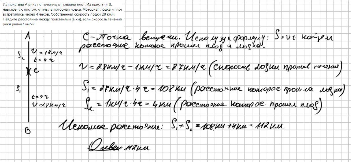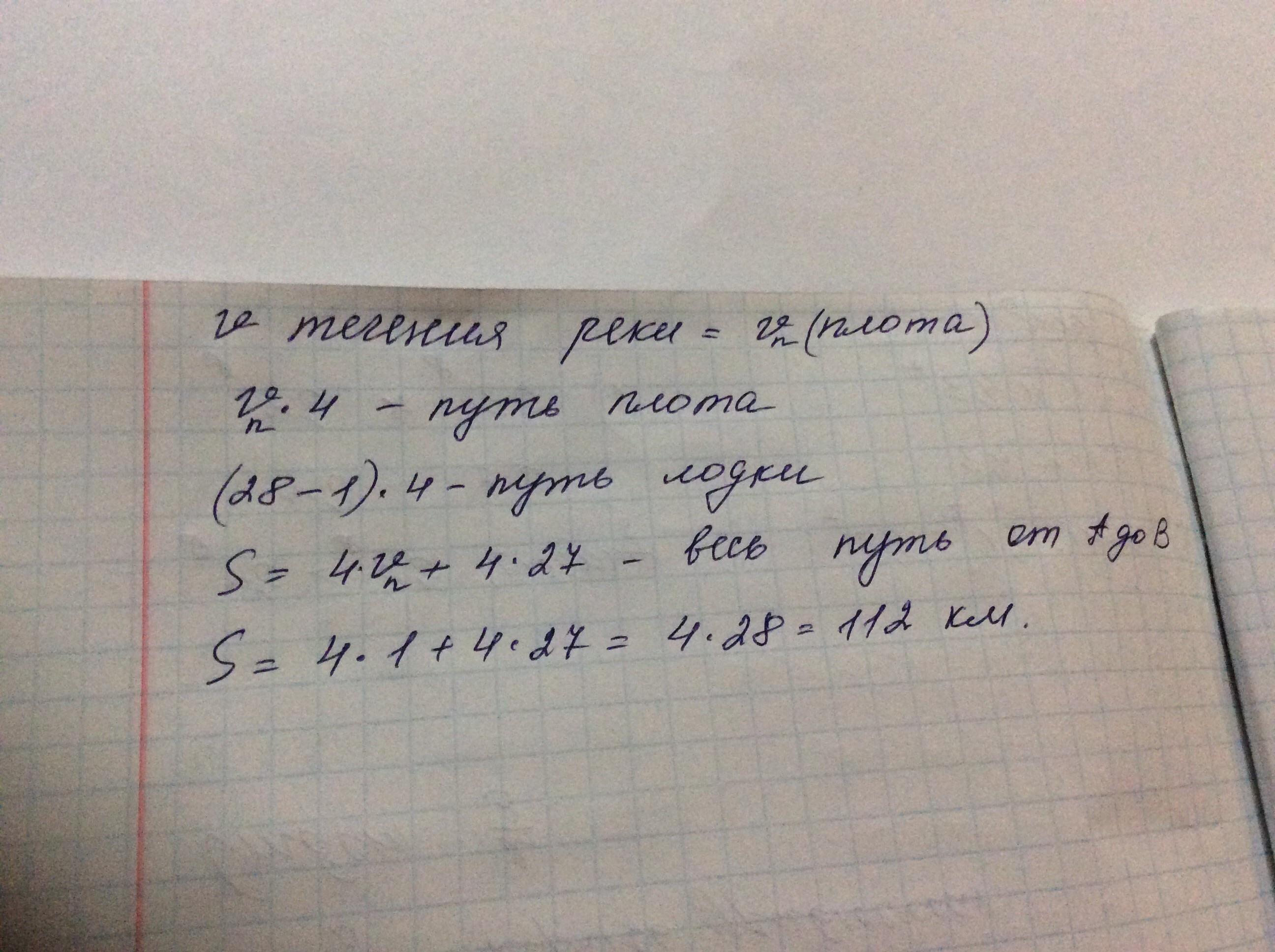 Из пристани А вниз по течению отправили плот. Из пристани В, навстречу с плотом, отплыла моторная лодка. Моторная лодка и плот встретились через 4 часов. Собственная скорость лодки 28 км/ч. Найдите расстояние между пристанями (в км), если скорость течения реки равна 1 км/ч?
