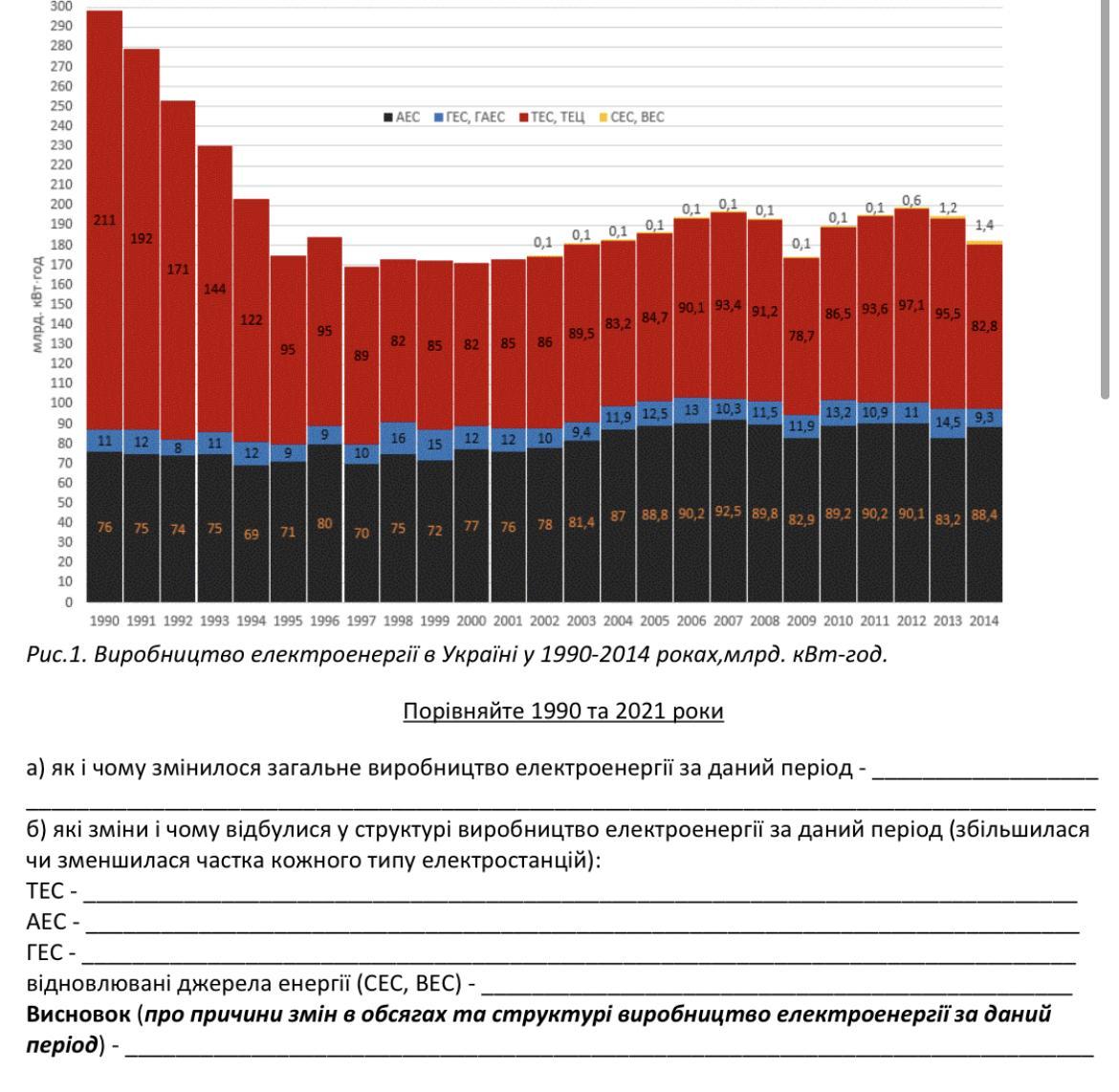 б) які зміни і чому відбулися у структурі виробництво електроенергії за даний період (збільшилася чи зменшилася частка кожного типу електростанцій) ФОТО НИЖЕ