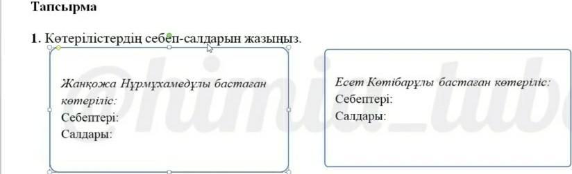 Восстание под предводительством Жанкожи Нурмухамедовича: причины: царское правительство выступило против захвата казахских земель и строительства на этих землях различных крепостей, неспособности казахов самостоятельно переселиться на свою землю последствия: восстание заканчивается поражением.Карательный отряд расстреливает и убивает героя-Жанкожа. Беспощадно грабят села восставших, лишают скотины имущества, сжигают дома. Активное участие в Хивинского ханства восстания вынужден был покинуть перу голода уйдет, в зависимости от рода предельные