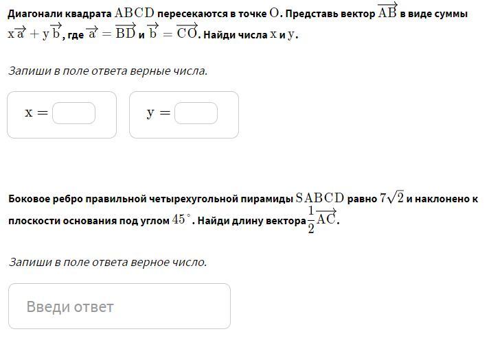 Рисовать стрелочки над векторами лень, уж Вы меня извините. Равенство векторов OA и CO следует из того, что диагонали квадрата в точке пересечения делятся пополам (впрочем, это же верно для любого параллелограмма).