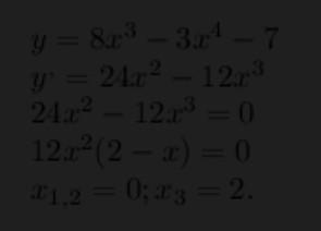 Так как точка х=0 являетсядвойной, то производная в ней не меняет знак, следовательно эта точка не будет экстремумом, она является точкой перегиба, а в точке х = 2 производная меняет свой знак с + на - (смотрим слева направо), значит в этой точке функция будет иметь максимум. у(2)= 8*8-3*16=16. Точка максимума будет иметь координаты (2;16).