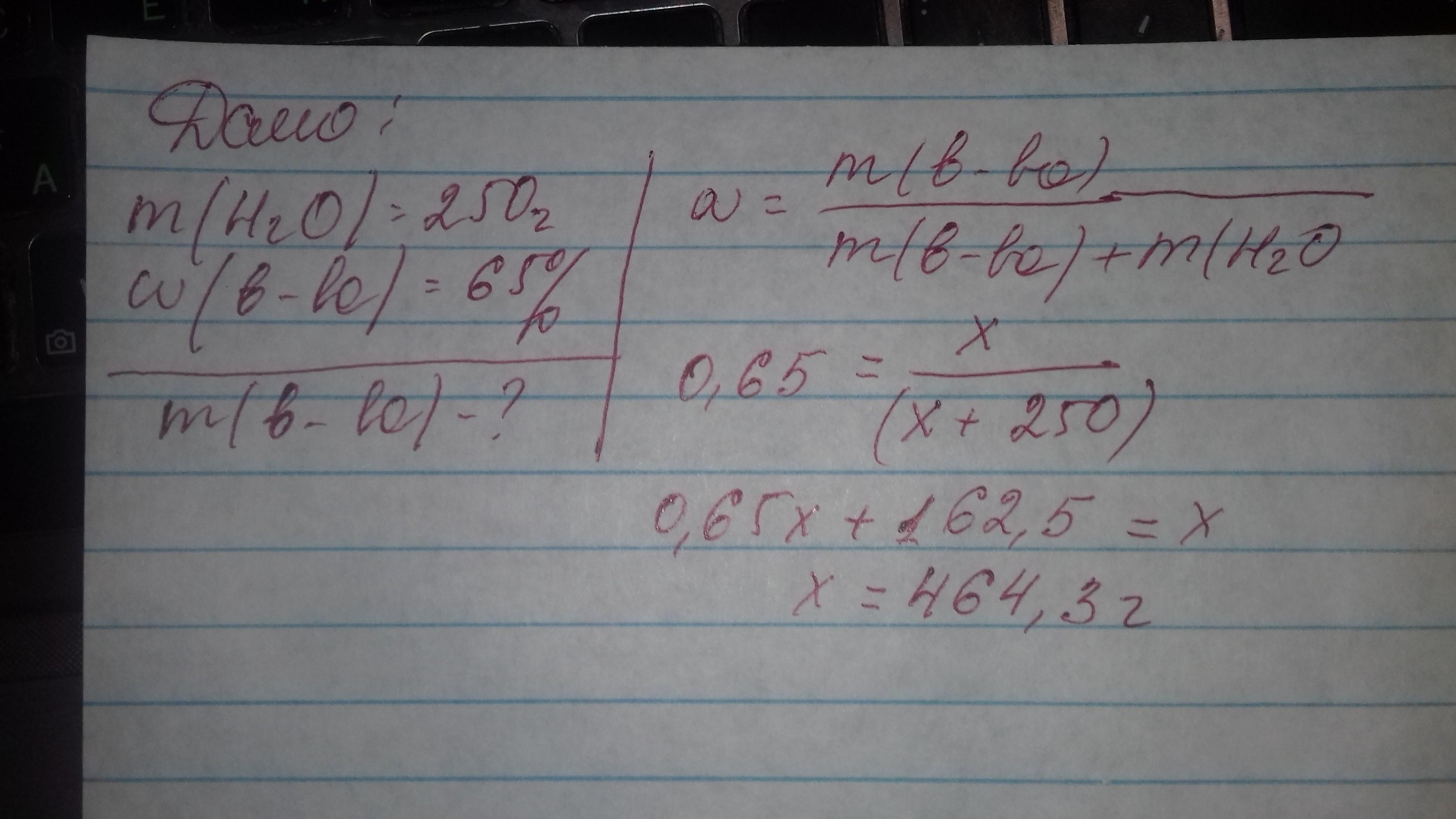 Найдите массу вещества, которое надо растворить в 250 г воды, чтобы получить раствор с массовой долей 65 %