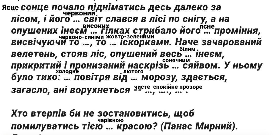 Допоможіть будь ласка! потрібно виписати з тексту іменники разом із прикметниками. Над "..." я надписала слова які були пропущені у тексті.