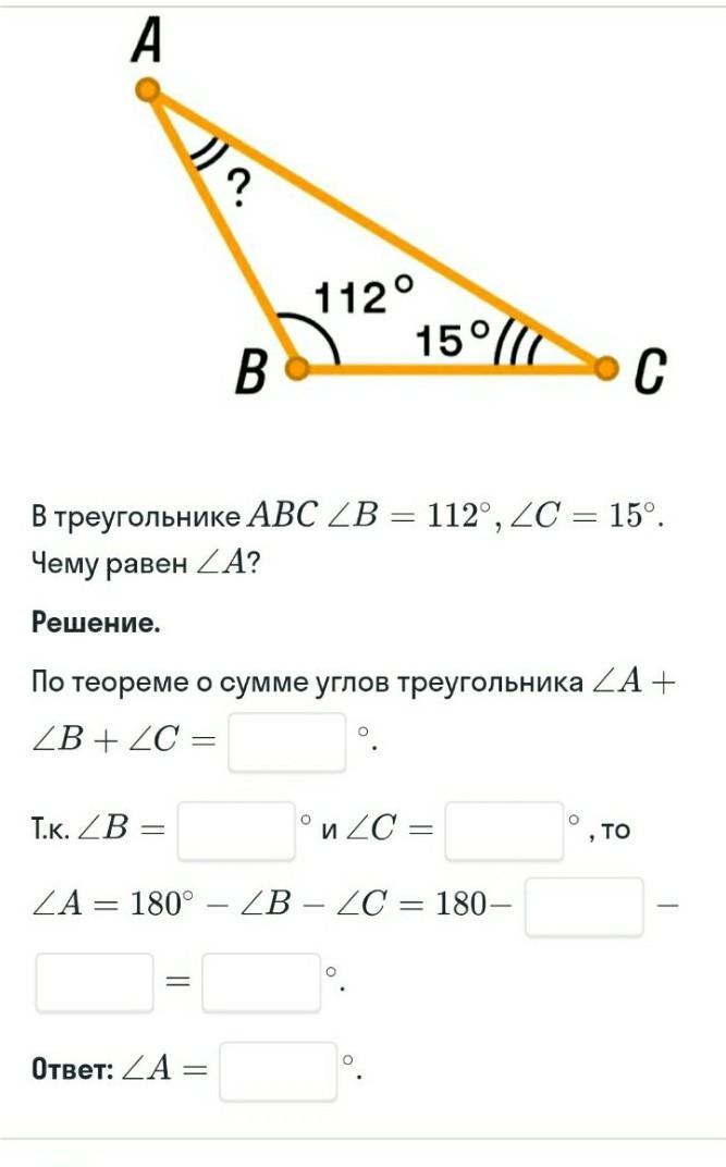 Т.к. В=112° и С=15°, то ........ = 180-112-15=53°.