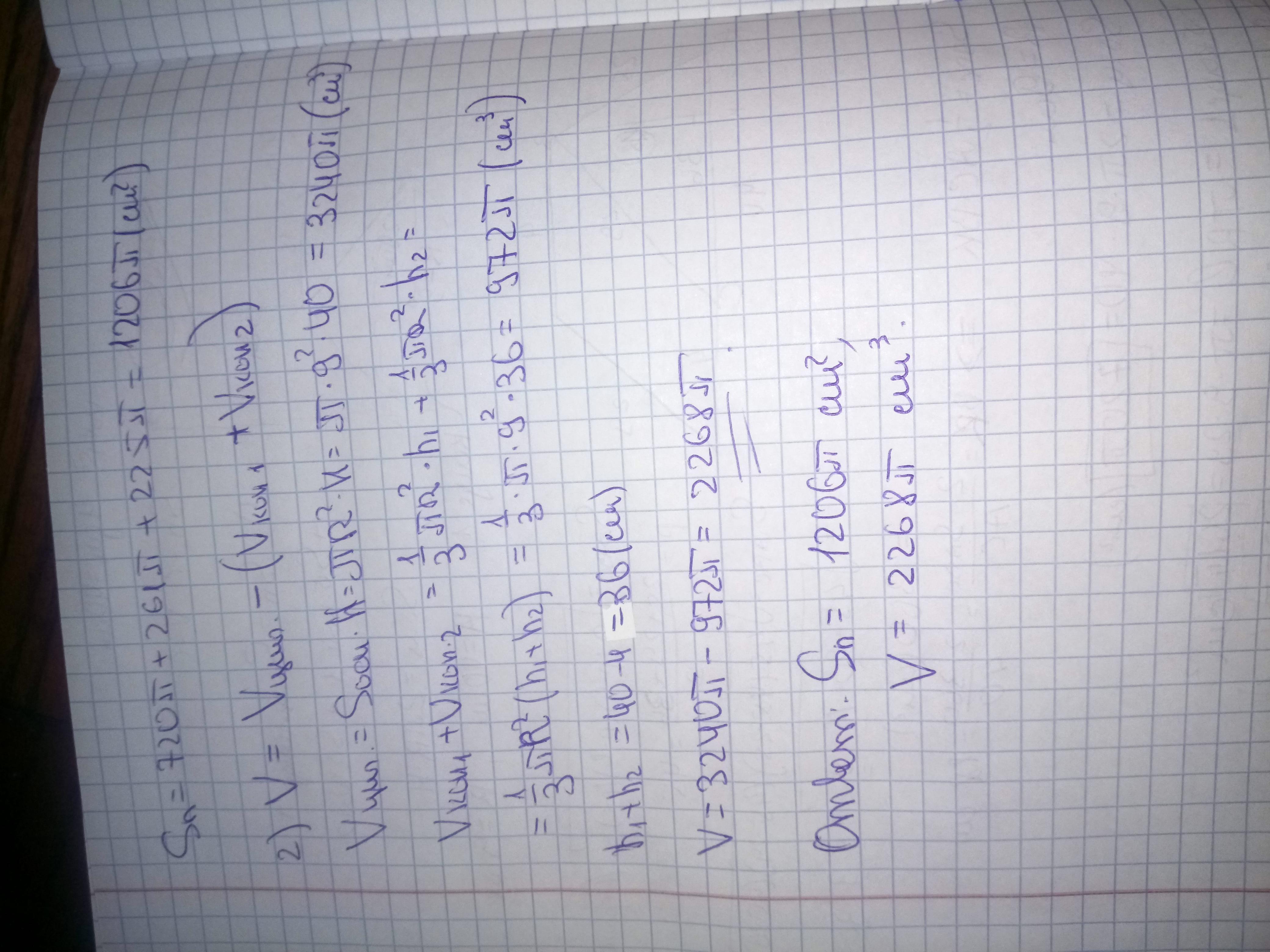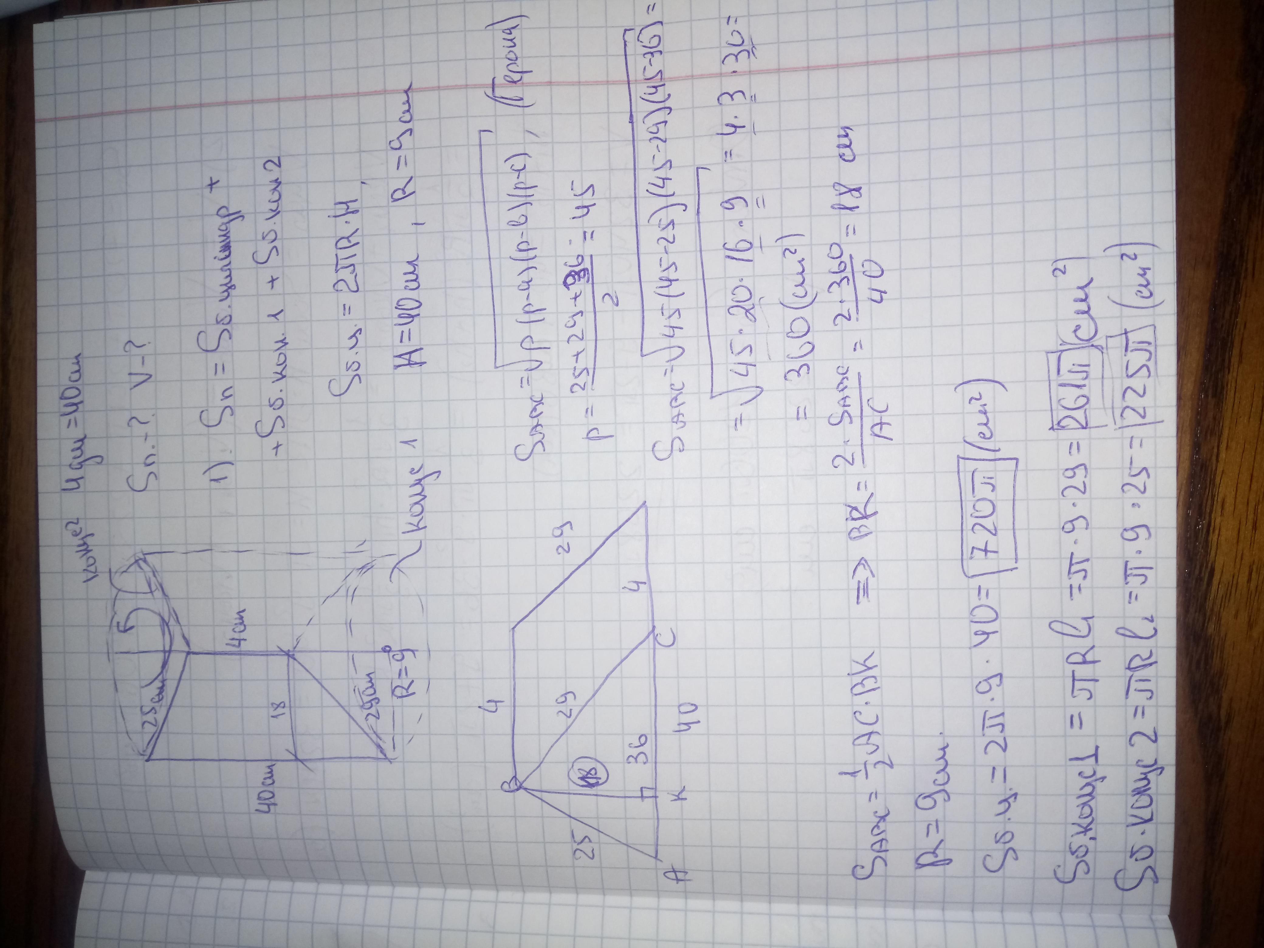 25 см и 29 см, вращается вокруг меньшего основания. Найдите площадь поверхности и объем полученного тела вращения.