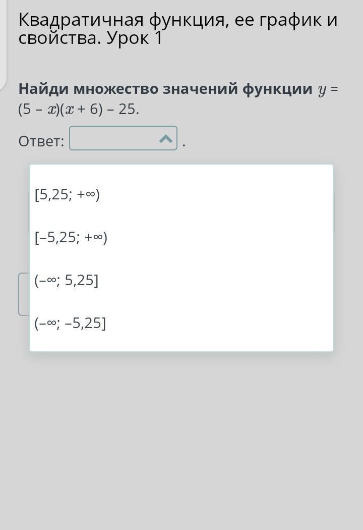 Квадратичная функция, ее график и свойства. Урок 1 Найди множество значений функции y = (5 – x)(x + 6) – 25. Ответ: .
