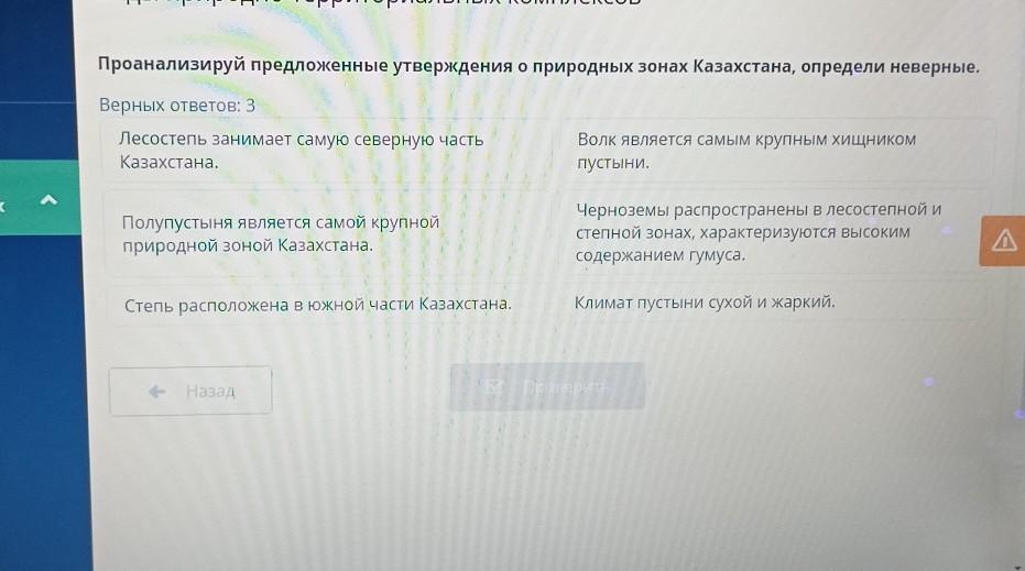 - X Виды природно-территориальных комплексов Проанализируй предложенные утверждения о природных зонах Казахстана, определи неверные. Верных ответов: 3 Лесостепь занимает самую северную часть Казахстана. Волк является самым крупным хищником пустыни. Черноземы распространены в лесостепной и степной зонах, характеризуются высоким содержанием гумуса. Полупустыня является самой крупной природной зоной Казахстана. A Климат пустыни сухой и жаркий. Степь расположена в южной части Казахстана. Назад RU 11:40 07.02.2022