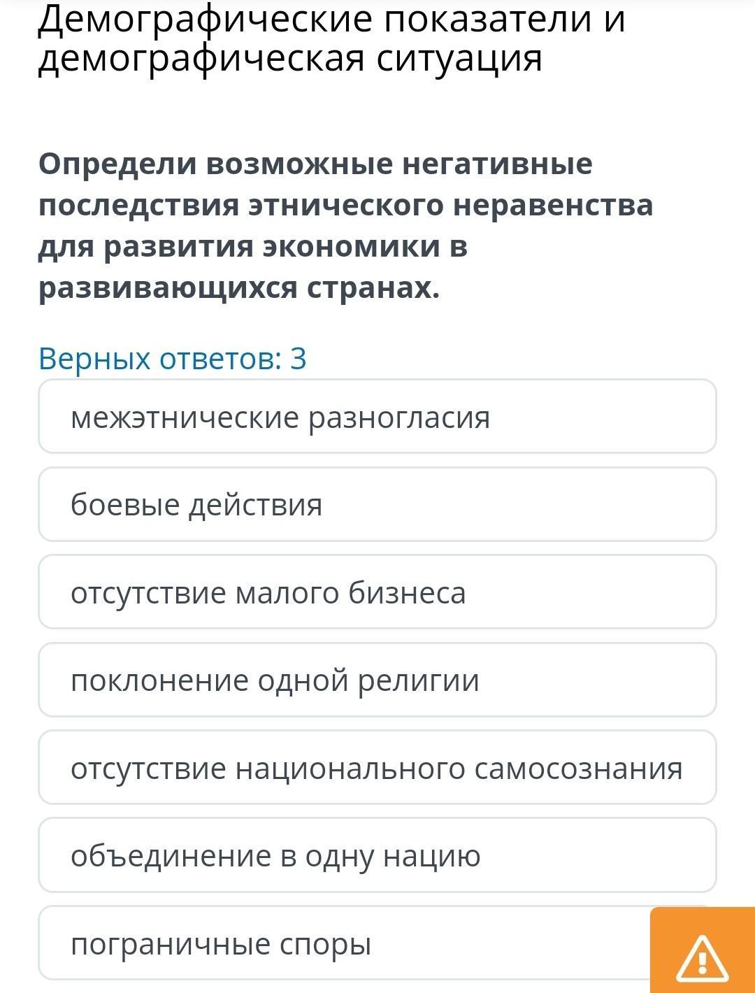 Демографические показатели и демографическая ситуация Определи возможные негативные последствия этнического неравенства для развития экономИКИ В развивающихся странах. Верных ответов: 3 межэтнические разногласия боевые действия отсутствие малого бизнеса поклонение одной религии