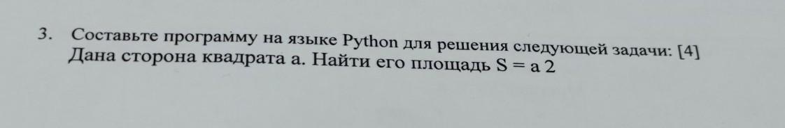 3. Составьте программу на языке Python для решения следующей задачи: [4] Дана сторона квадрата а. Найти его площадь S = а2