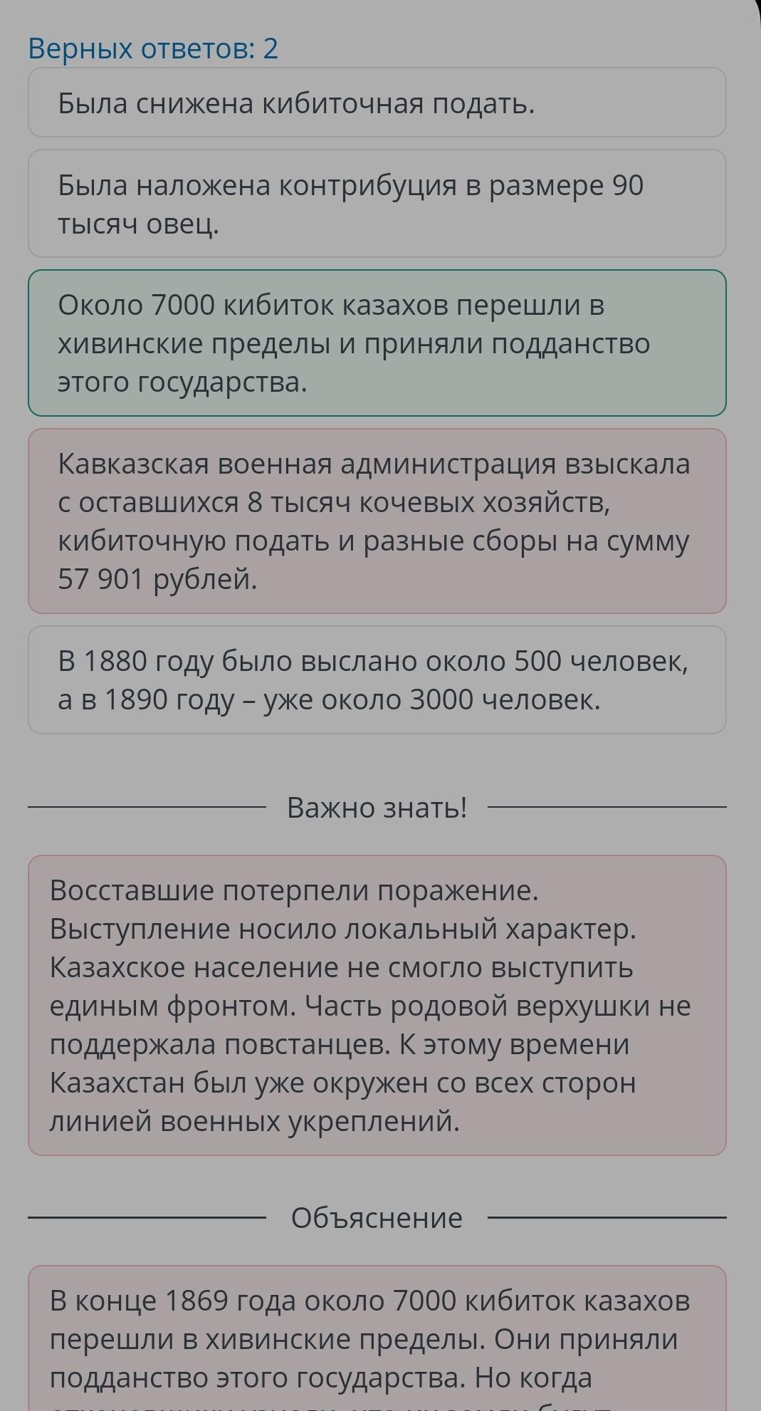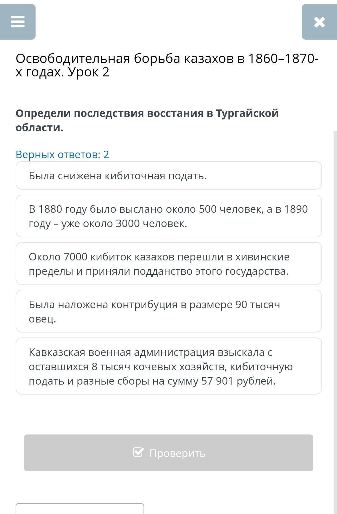 Освободительная борьба казахов в 1860–1870-х годах. Урок 2 определи последствия восстания в Тургайской области верных ответов: 2
