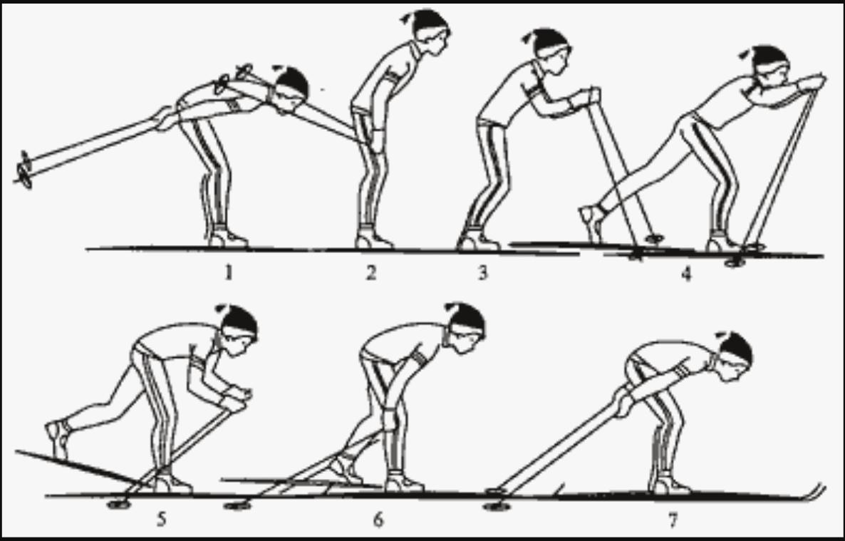 1. После окончания толчка руками лыжник скользит на лыжах.