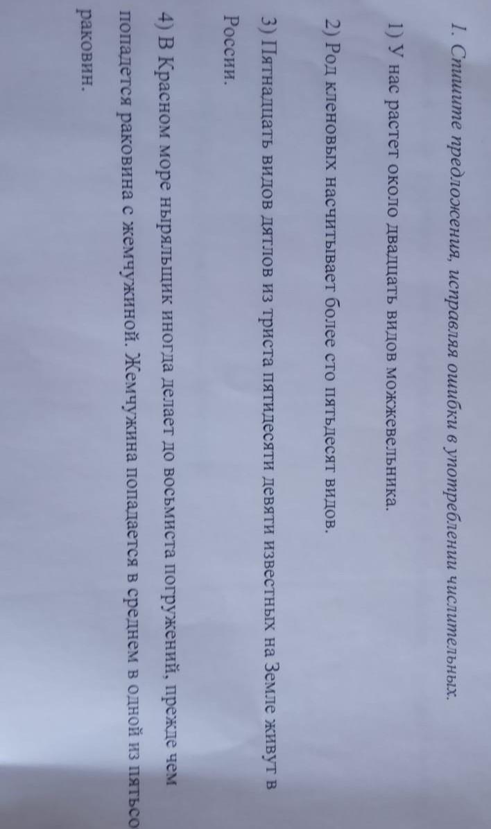 Спишите предложения, исправляя ошибки в употреблении числительных. 1) У нас растет около двадцать видов можжевельника. 2) Род кленовых насчитывает более сто пятьдесят видов. 3) Пятнадцать видов дятлов из триста пятидесяти девяти известных на Земле живут в России. 4) В Красном море ныряльщик иногда делает до восьмиста погружений, прежде чем попадется раковина с жемчужиной. Жемчужина попадается в среднем в одной из пятьсот раковин. 5) Ученые насчитывают более двести пятьдесят видов жуков. 6) Площадь крупных ландшафтных заповедников достигает пятьсот – семьсот тысяч гектаров.