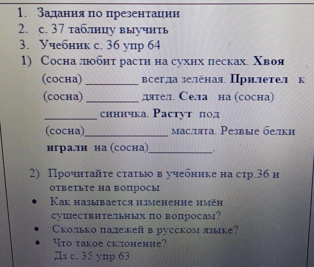 1. Сосна любит расти на сухих песках. Хвоя (сосны) всегда зеленая. Прилетел к (сосне) дятел. Села на (сосну) синичка. Растут под (сосной) маслята. Резвые белки играли на (сосне).